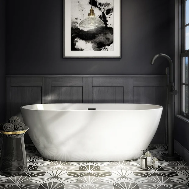 The striking Arezzo Freestanding Modern Bath, this stand alone bathtub has a contemporary rounded double ended shape, allowing you to rest your head at either end. It’s made from high-quality white gloss acrylic that holds its warmth, so you can lie back and relax in the bubbles for even longer. Supplied with matt black easy clean click clack bath waste and overflow.