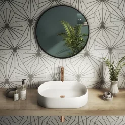 Slender and elegant, the matt white finish Arezzo Oval Counter Top Basin will complement a range of modern bathrooms. At 600mm wide, this ceramic countertop basin is designed to sit on top of a flat surface with a high rise or wall mounted tap. The clean lines and curved oval design of this matt white finish wash basin will enhance the style and look of any bathroom. Pair it with a tap in a contrasting colour – like the Arezzo Matt Black High Rise Mono Basin Mixer Tap – for a striking look. Some small dimensional variation may occur due to manufacturing tolerances. Waste not included.Â