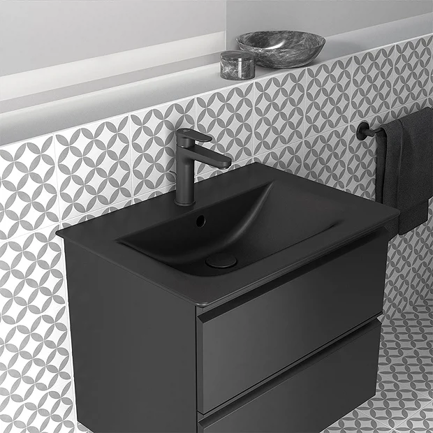 The Connect Air Silk Black 640mm basin will make a design statement in the bathroom with it’s bold and square geometric lines. This stylish silk black basin is manufactured using high quality vitreous china and features a single tap hole and built in overflow. Can be wall hung or mounted on top of Connect Air basin units.