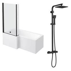 Arezzo Square Matt Black Shower Bath + Exposed Shower Pack (1700 L Shaped With Screen + Panel)